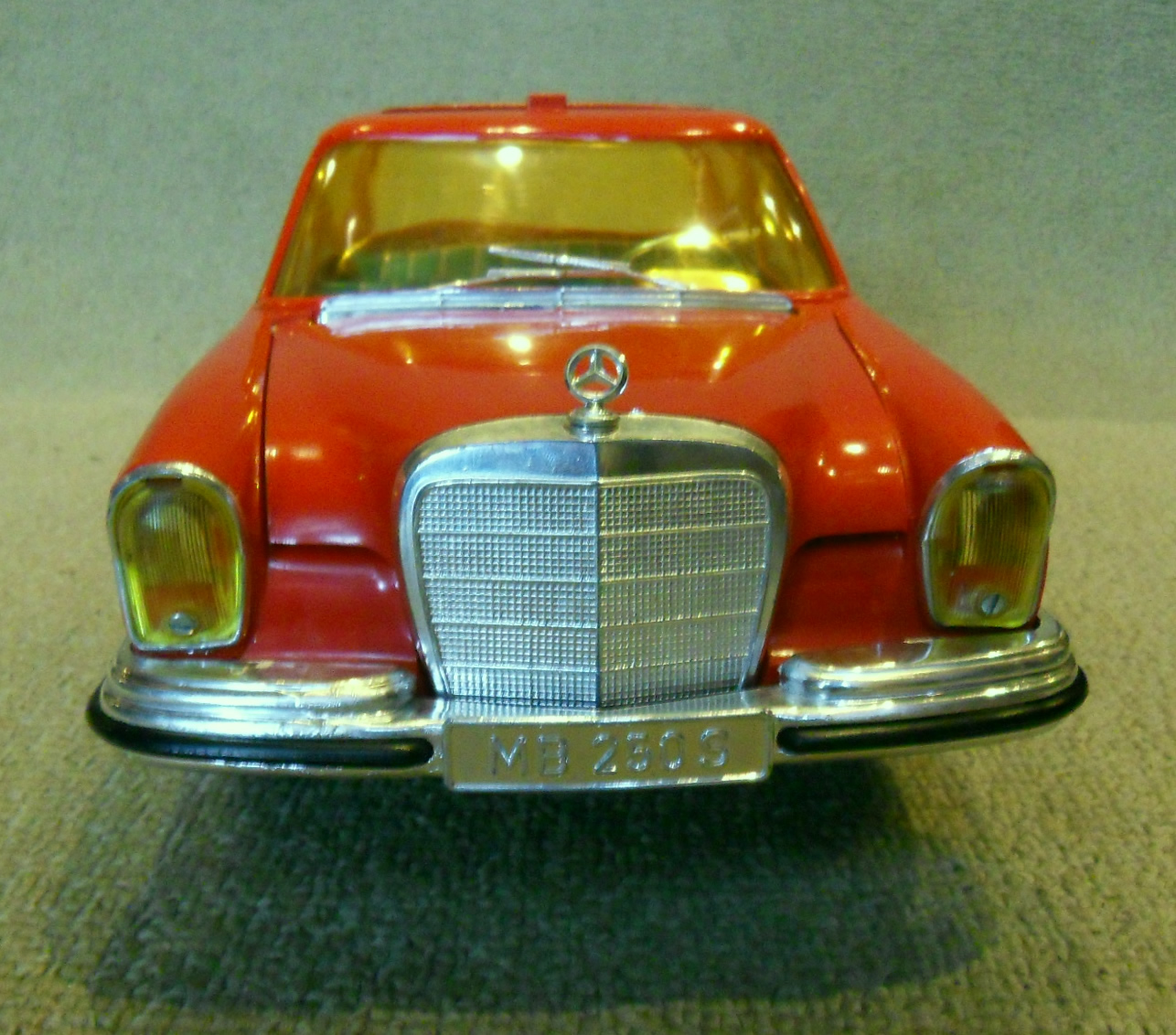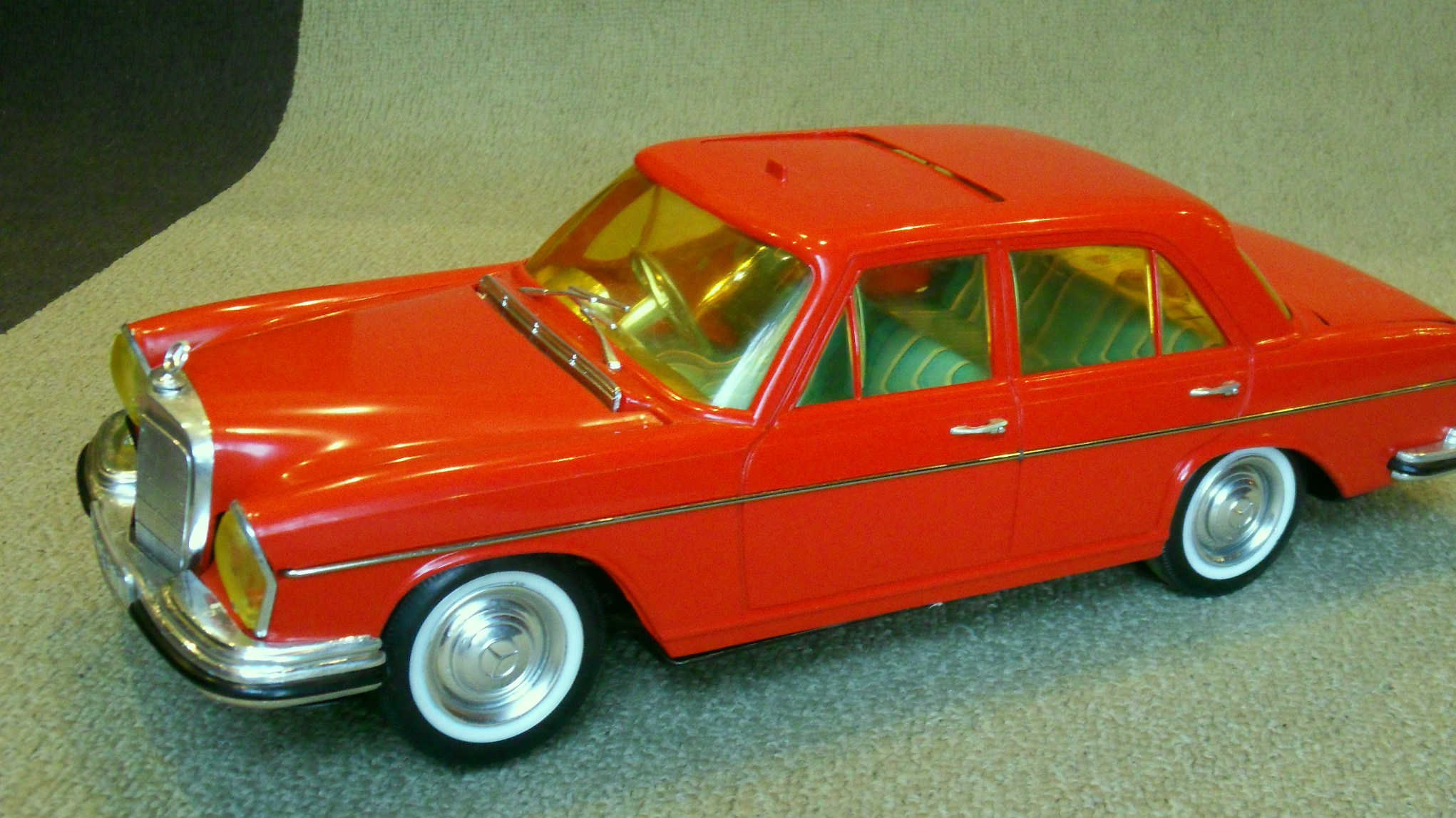 Se trata de un mercedes de la serie S o serie diplomática, modelo 250 en color rojo charol fabricado por la marca Rico: